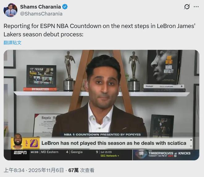 “詹姆斯可能会跟NBA发展联盟的南湾湖人队一起训练,等湖人从5连客回来之后再跟全队合练,本赛季的个人首秀可能会在11月中旬,但现在一切都是未知的。”Shams这么报道。
